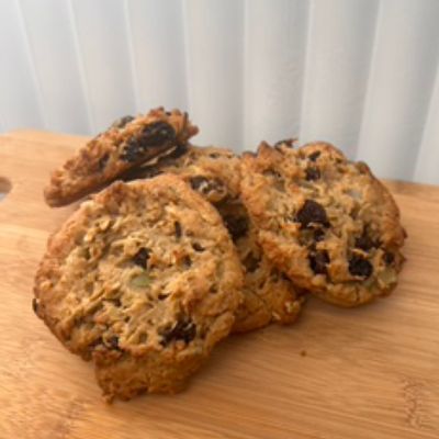 Granola cookie containing raisins, pepitas, oats, dark chocolate