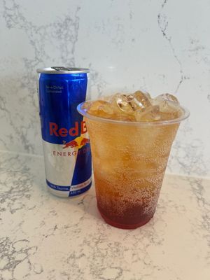 Red Bull add Berry 250ml can of red bull, over ice, add strawberry syrup