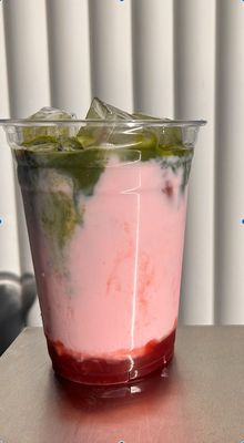 Two teaspoons pure Matcha, in a 16oz cup, loaded with ice & strawberry milk.